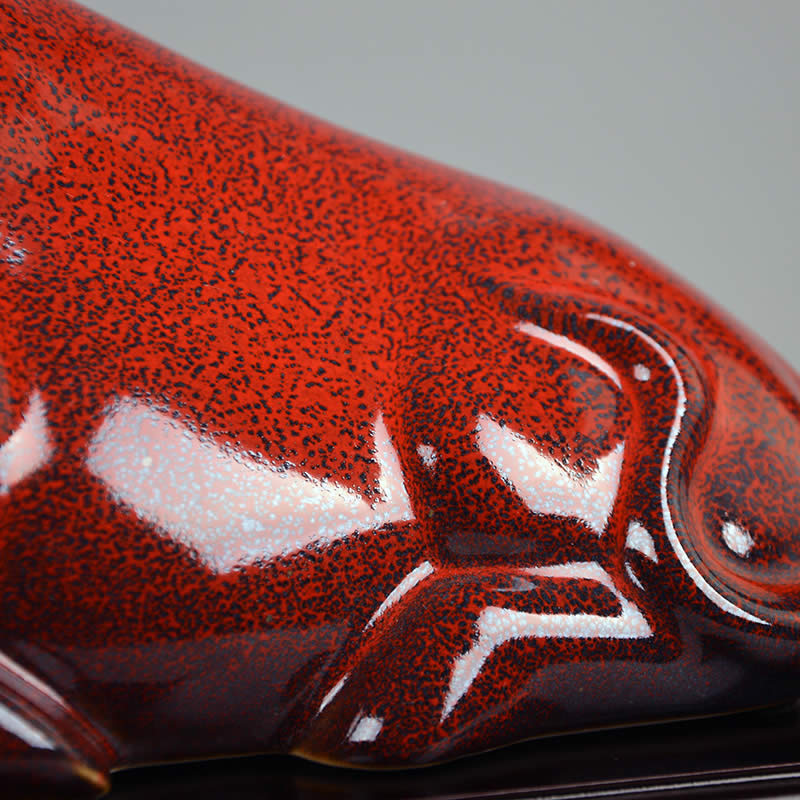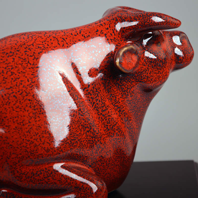 《開運紅?!飞ご傻裣抵袊沾稍O計藝術大師劉少平先生新年力作。ニ0二一年為辛丑年,即民間俗稱牛年。為策應民眾新春賀歲之需,大師以其擅長的瓷塑造型技能,嫻熟而生動地塑造出健牛靜臥如山的瞬間情態(tài)。其刀刻線條,筆不暢而意;線型粗短,隨牛的體態(tài)結構而起伏變化,準確表達出健牛粗厚的毛皮、勁健的筋肉質感和溫厚老成的性格。在條組合上形成強烈的形式美感。兼之以高溫色釉面敷彩,濃烈而氣生,厚重而溢韻。觀之下,恍若能觸牛之毛汗之氣,能聞牛之喘息之聲。大師用簡明扼要的瓷雕藝術語言和穩(wěn)宜的色彩語匯所表述的動物造形方法,是景德鎮(zhèn)陶瓷雕塑行業(yè)中頗為少見的典型樣式,是謂中生代大師輩中難得的精品力作之一。