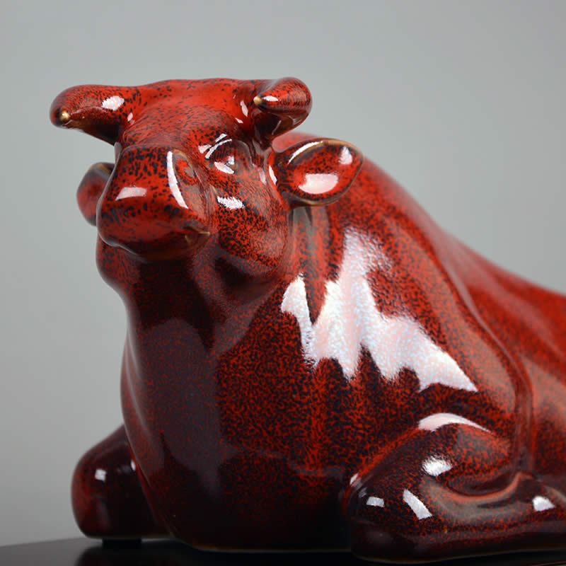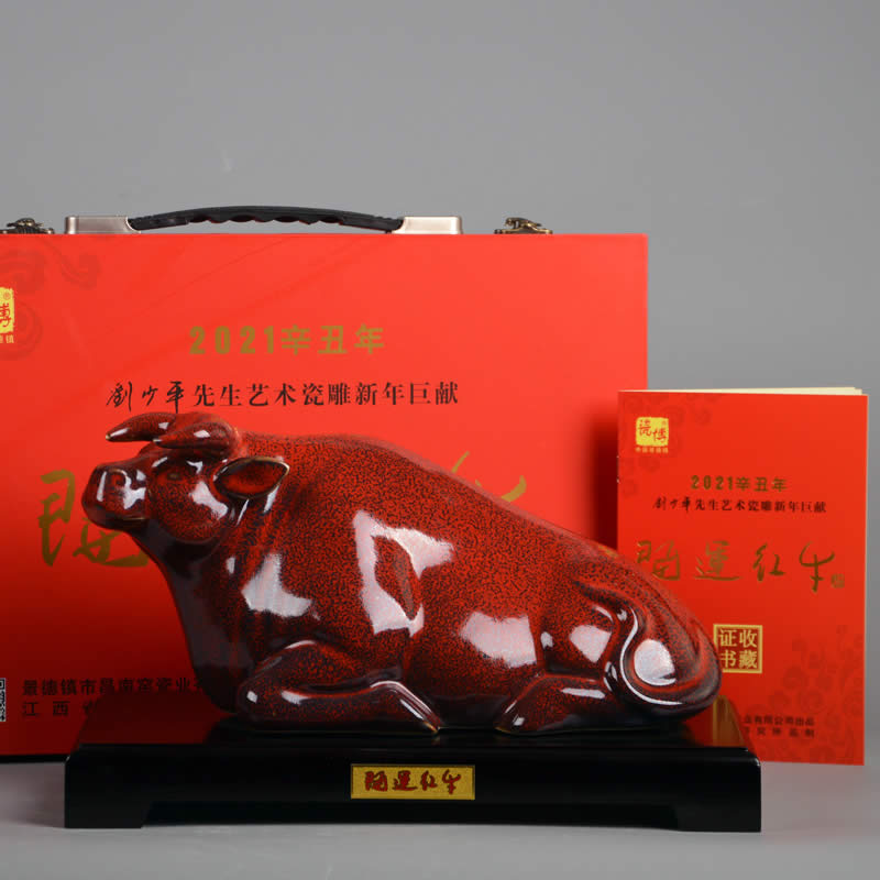 劉少平《開運紅牛》生肖牛陶瓷雕塑 牛吉祥物擺件工藝品辦公室桌面玄關新年禮品