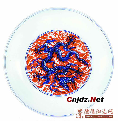 明代釉上紅彩始于洪武,但數(shù)量極少。在清初釉上彩飛速發(fā)展的康熙期,仿制前朝各品成為景德鎮(zhèn)官窯的時尚,青花龍紅海水紋盤也在其中。