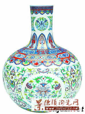 這件清乾隆青花斗彩描金花卉紋天球瓶,原物早已流失海外,現(xiàn)藏于日本松崗美術(shù)館,經(jīng)與日方多次磋商,幾經(jīng)周折才把國寶“克隆”回國。此件物品是乾隆皇帝鐘愛之物,陳設(shè)于皇家最顯貴的地方。其胎潔白細(xì)膩,造型優(yōu)美,口沿描金錦紋,腹部纏枝開光團(tuán)花紋,整個紋樣繁茂,線條工細(xì)而不失其生動有力,形象工整而不失其豪放和張力,色彩單純而不失華富和熱烈,是一種工藝性極強,最有繪畫功力,藝術(shù)水平極高的高檔陳列收藏品。