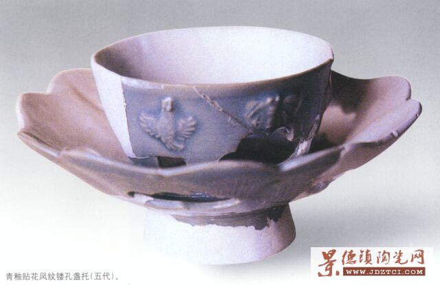 這件盞托,著色淡雅,鏤空、貼花等裝飾使其更具特色。