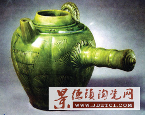 這件遼代綠釉刻花單柄壺(見圖),高14厘米,口徑4.5厘米,足徑7.5厘米,壺小口,口內(nèi)收,豐肩,下腹部漸內(nèi)收。壺身肩部一側(cè)有多棱形短流,與之相對應(yīng)處為雙條形繩系。在壺流與系之間腹部一側(cè)有竹節(jié)形橫柄,柄端有一凸形紐。壺肩部飾雙凸弦紋,在弦紋之間飾八組以點組成的扇形紋。壺身為四瓣瓜棱形,在每瓣內(nèi)飾不規(guī)則的、大小相間的點線組成的扇形紋。整個壺身施以綠釉,色彩艷麗。