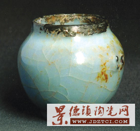 圖中所示粉青釉罐式鳥食缸,高5.8厘米,腹徑6厘米,口徑4.4厘米,底徑3.5厘米。釉色瑩潤凝脂,青中帶藍(lán),滿含寶光,薄胎厚釉的工藝顯露官窯的特質(zhì)。釉層中積聚著無數(shù)大小不一的氣泡,“聚沫攢珠”的特征印證了其官窯身份。小器大開片更覺稀罕,金黃色紋片紛崩迸裂,自然天成,真乃鬼斧神工。胎體堅(jiān)致細(xì)膩呈褐黑色,施釉及底,修足規(guī)整,毫無拖泥帶水之感。僅1毫米底足露胎處光潔平滑呈鐵足,口沿包銀更顯精貴,包銀脫落處可見口沿施釉薄透呈現(xiàn)紫色,形成官窯典型的紫口鐵足?趶酱笥诘讖降脑煨筒粌H豐滿端巧,而且便于鳥啄食 內(nèi)底呈凹弧狀也是專為喂鳥設(shè)計(jì) 。可惜固定用的環(huán)把缺損,留下了四點(diǎn)露胎的疤痕,讓人感到世事滄桑的久遠(yuǎn)。宋代上層貴族文人崇尚理學(xué),返璞自然,其審美情趣趨向素凈高雅,講究器型的雍容和色彩的純正,摒棄裝飾的繁縟和習(xí)俗的低庸!昂喖s”是當(dāng)時(shí)的時(shí)尚,是美的最高境界。南宋官窯瓷器正是體現(xiàn)了上層人物的這種精神上空靈取向和物質(zhì)上奢華追求。小小鳥食缸見證了宋代的輝煌和衰落。