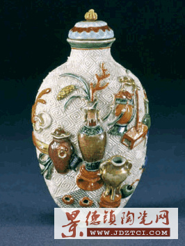煙壺呈扁形,瓷蓋,下連竹勺。壺通體刻回紋地,上雕爐、瓶、靈芝、茶壺、圍棋、鼎等紋飾,俗稱“博古圖”,施紅、綠、紫、藍(lán)、黑等色。足底雙框方欄內(nèi)紅彩篆書“乾隆年制”四字款。