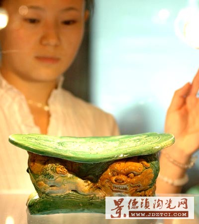 8月3日,“盛夏華章精品拍賣會(huì)”拍品預(yù)展于北京亞洲大酒店舉行,據(jù)主辦方介紹,本次預(yù)展品分千年古瓷枕、明清瓷器、佛教藝術(shù)品、名品紫砂壺與陳年普洱茶等專場。其中“千年夢華──古瓷枕”專場最為搶眼,展出中的唐、宋、金時(shí)期陶瓷枕,不少是從海外征集而來,具有極高的藝術(shù)價(jià)值和商業(yè)價(jià)值。據(jù)悉,拍賣會(huì)將于8月5日在京開槌,屆時(shí)除古瓷枕之外的展品均參與競拍。圖為工作人員在展示一款金代的“醬黃絞釉雙獅形枕”。