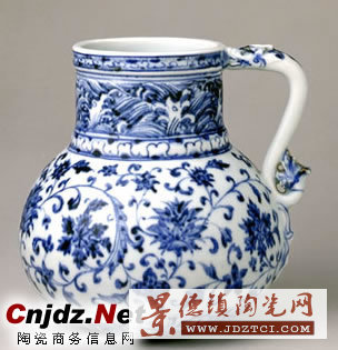 此花澆青花色澤濃艷,有黑色結(jié)晶斑。其造型風(fēng)格系仿西亞黃銅壺器物。
