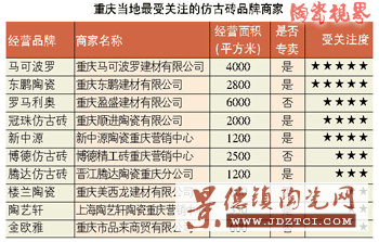 重慶陶瓷市場的仿古磚品牌有馬可波羅、東鵬、冠珠、新中源、瑪拉茲、金意陶、騰達、陶藝軒、博德、羅馬利奧、樓蘭、賽德斯邦、圣·凡爾賽、薩米特、奧米加 金歐雅、簡一、金朝陽、陶一郎、圣陶坊、大唐合盛、宏宇、匯亞、嘉駿、冠軍、P·K、能強、帝舵、鉆石、建輝等。