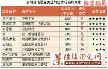 經(jīng)營仿古磚的商家大概有260家左右,占到建筑陶瓷商戶比例的30%左右,其中專賣仿古磚的商家有150家左右。仿古磚專賣店主要有馬可波羅、東鵬、冠珠、陶藝軒、羅馬利奧、樓蘭、奧米加、冠軍、圣陶坊等。