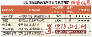 在昆明經(jīng)營仿古磚產(chǎn)品的商家有350多家,占整個昆明建陶商戶的35%左右。其中仿古磚專賣的商家有近100家。專賣店主要品牌有:馬可波羅 、瑪拉茲、金意陶、羅馬利奧 、樓蘭、圣·凡爾賽、圣陶坊、路易摩登、簡一、陶一郎、皇磁、冠軍、東鵬、鉆石、金西州、順陶匯亞、佳一等。