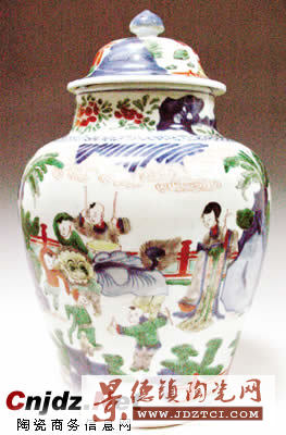 直口、豐肩、斜腹、平底,配有寶珠鈕蓋。通體施亮青釉,外腹通景彩繪四妃十六子圖,婦人與童子嬉戲于山石庭院之中,體態(tài)各異,有靜有動,富有表現(xiàn)力。所用色彩鮮艷,釉下青花結(jié)合釉上彩繪,大紅大綠,視覺效果極強(qiáng),是件難得的瓷品。