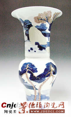 喇叭狀口、腹部圓鼓、近足處外撇、二層臺(tái)圈足;器身罩亮青釉,釉層堅(jiān)致微帶鴨蛋青色,圈足無(wú)釉,露灰白色胎,胎質(zhì)細(xì)膩,磁化程度高;器身上下兩部分皆以釉下青花、釉里紅、釉下米黃三色飾山水紋,三種彩料色澤亮麗,濃淡相宜,畫(huà)面寧?kù)o悠遠(yuǎn),賞心悅目。山水紋是康熙器物使用較多的紋飾,風(fēng)格靈活多變,技法新穎講究,具有頗高的藝術(shù)成就,這與中國(guó)山水繪畫(huà)的演變與發(fā)展有很大的關(guān)聯(lián)。
