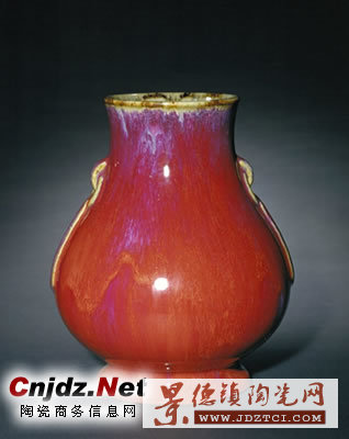 此瓶釉色鮮艷濃重,宛如燃燒的火焰般燦爛奪目,為窯變釉中“火焰紅”的典型作品。瓶的口沿處和耳部因釉層流動變薄而形成的燈草邊是雍正時期窯變釉類瓷器的特征之一。