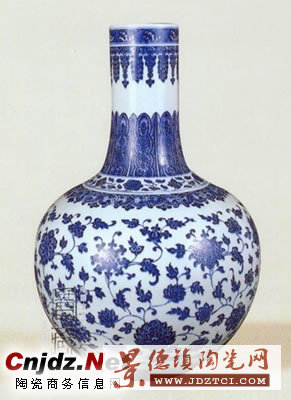天球瓶因腹部像球狀而得名,造型的另外兩個(gè)特征是直口、長(zhǎng)頸。流行于清代乾隆以后。此件是乾隆官窯青花大器,底部?jī)?nèi)凹形成圈足,內(nèi)壁施白釉,外壁紋飾依次為海浪紋、花葉紋、蕉葉紋、纏枝什錦花卉紋、束花卷草紋、蓮瓣紋。腹部所繪纏枝什錦花卉紋,是乾隆朝官窯瓷的典型主題紋樣。乾隆官窯瓷器中,器型高大的天球瓶有多件,僅紋樣不同,有的通體繪纏枝西番蓮蝙蝠紋。