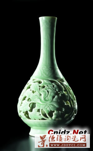 這是一尊夾層玲瓏瓶,附著粉青釉,浮雕芭蕉葉,色澤溫潤可人,制作者巧妙地利用內(nèi)瓶加固,用以承托外壁帶兩朵纏枝牡丹圖案透雕的瓶身。據(jù)說,現(xiàn)今僅有一件造型紋飾與它完全一致的玲瓏瓶,藏于北京故宮博物院。按照制造年代推算,這件玲瓏瓶很可能是大名鼎鼎的督陶官唐英進呈乾隆帝的精品。唐英在乾隆二年正式成為督陶官,督導陶務前后20余年。眾所周知,這一時期的清宮瓷器,無論在品種創(chuàng)新,還是在器物的制作技巧方面,都達到了空前水平。即將拍賣的清乾隆長頸膽套瓶,香港蘇富比給出的估價為1500萬-2000萬港元。