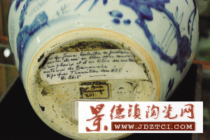 據(jù)陳經(jīng)理介紹,該瓷罐是在一次海外回流物品展賣會上購得的。作為海外回流的物件,其收藏價值較高。我們在罐子底部發(fā)現(xiàn)貼有標簽,上面寫有精美外文,看起來已有些年頭。其上唯一的數(shù)字即1635,此時正值明崇禎八年。據(jù)介紹,這是一位國外收藏家粘貼上的標識,這與其海外回流的身份不謀而合。