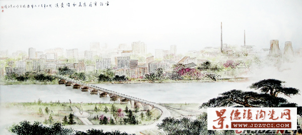 陳盛榆對山水的文化特征與精神感應(yīng)表現(xiàn)得十分古典又十分現(xiàn)代,從而獲得具有新古典精神的現(xiàn)代山水藝術(shù)。對山水瓷畫作品的創(chuàng)作從外部的景觀轉(zhuǎn)向內(nèi)在的心靈,從而使形式的和諧轉(zhuǎn)變?yōu)楦哔F的心靈和諧,創(chuàng)造了一種可以親和自然、可以融合天地的藝術(shù)精神。陳盛榆的大型瓷板粉彩作品《富裕宜居秀美和》,表現(xiàn)的是黃金埠的景色。黃金埠是鷹潭、余干、余江、萬年、東鄉(xiāng)等縣交界區(qū)域著名的大商埠,自古商賈云集,是極具魅力的古鎮(zhèn)。這種寫實的現(xiàn)代市井風(fēng)景畫,與現(xiàn)代生活息息相關(guān)。如果沒有相當(dāng)?shù)墓α,普通?a href="http://iv978.cn" target="_blank">陶瓷藝人是不敢隨意為之的。但是陳盛榆毫不猶豫地就接受了,而且他取得了巨大成功。該作品隨后被某市政府收購,高高掛在市政府大廳,作為該市對外廣告的最好形象宣傳。