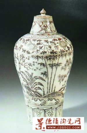 釉里紅歲寒三友紋梅瓶是現(xiàn)存的唯一一件帶蓋子而且保存完整的洪武釉里紅梅瓶,于1993年被國(guó)家文物局鑒定為國(guó)寶級(jí)文物。