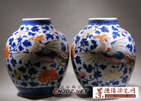 清嘉慶“青花暗刻粉彩鳳穿花卉紋罐”所施色彩濃重鮮艷,雖紋飾滿密,但主題鮮明。直口,短頸,豐肩,鼓身,收足。胎體厚實,造型規(guī)整,通身施白釉,釉面光滑,包漿古樸。頸上繪如意紋,肩上環(huán)飾青花枝葉紋,腹部滿飾,周身暗刻鳳紋,以五彩繪雙鳳穿花圖紋,相輔相成。鳳身扭轉,羽翼張開,姿態(tài)曼妙,自由飛舞在花間,鳳身翎羽詳細描繪,筆法灑脫,釉色艷麗,點綴幾朵富貴牡丹,高雅脫俗。