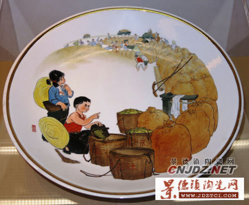 這件瓷盤所繪“數(shù)不盡”圖,以黃澄澄的糧食為背景,描繪了繁忙的豐收景象。畫面內(nèi)容沿著盤面由遠(yuǎn)及近地展開:遠(yuǎn)處運(yùn)輸糧食的卡車一輛接著一輛;打谷場(chǎng)上的糧食堆成了山,有的人在裝袋,有的人在稱重,有的人在扛糧食,有的人在裝車;近處堆滿了鼓鼓的糧食袋;兩個(gè)撿拾稻穗歸來的小朋友背著草帽,拿著笸籮,正蹲在糧食筐的邊上數(shù)糧食。裝著糧食的麻袋與編筐上以紅彩書寫有“生產(chǎn)隊(duì)”“人民公社”等字樣。畫面左下鈐紅彩楷書“數(shù)不盡”三字,以點(diǎn)明畫面主題。該作品題材新穎,繪畫生動(dòng),再現(xiàn)了農(nóng)村人民公社化運(yùn)動(dòng)中的人們生產(chǎn)與生活的面貌。
