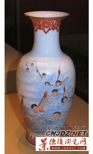 這件瓷瓶所繪畫面描繪了少先隊員們響應(yīng)毛主席號召暢游江河的情景。他們扛著紅纓槍,奮力拼搏,每個人的臉上都洋溢著自信、喜悅的笑容,眼眸中充滿著堅毅與剛強(qiáng)。畫面充滿了青春的朝氣,反映出新中國體育事業(yè)蓬勃發(fā)展的景象。
