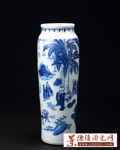 明崇禎,青花會(huì)昌九老圖筒瓶,H:44cm。筒瓶闊口微撇,直頸略束,溜肩,直筒形長腹,砂底無釉。筒瓶造型出于萬歷年間而略有變化,器口較之前開闊,微撇。胎體致密,胎土白中泛黃,釉面潔凈晶瑩,青花發(fā)色純正,繪制“會(huì)昌九老”指唐代會(huì)昌五年(845年),著名詩人白居易等九位高壽者,在河南香山(今洛陽龍門附近)聚會(huì)、游宴的故事,后被人傳為佳話,寓意福壽綿長之意。北京故宮博物院清宮舊藏清乾隆青玉御題詩會(huì)昌九老圖玉山,其所雕刻的題材即為會(huì)昌九老圖,由此可見宮廷對(duì)此題材的喜愛和重視。人物簡(jiǎn)筆勾勒已神形兼?zhèn),以平涂為主卻也有遠(yuǎn)近層次,意趣盎然。肩與近足處各飾一周幾何暗刻紋,此種裝飾手法為明末清初所有,康熙時(shí)期的筒瓶已不見這種裝飾手法。