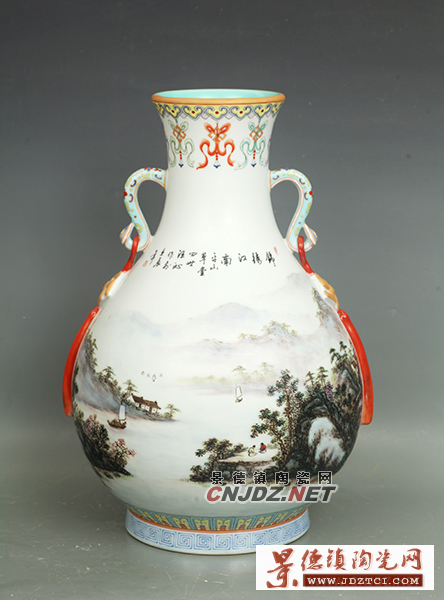 縱觀幾代“汪派山水”,不難發(fā)現(xiàn)“汪派山水”繼承了中國傳統(tǒng)文人畫中的品位。講究融詩、書、畫于一體,由作者本人書畫并題。作品意境深遠(yuǎn),色彩淡雅,以景傳情,具有強(qiáng)烈的感染力。因此能表現(xiàn)作者主觀思想志趣與審美觀念,突出個人的創(chuàng)作風(fēng)格與個性。也能體現(xiàn)作者的文化藝術(shù)修養(yǎng)和哲學(xué)思想。山水創(chuàng)作將國畫的皴、擦、暈、染等技法融入瓷畫創(chuàng)作,通過陶瓷這個載體表現(xiàn)個人思想情感和審美旨趣,這完全有別于傳統(tǒng)山水的勾線填色和富麗重彩,而顯得清雅脫俗,個性風(fēng)格突出,使作品有很高的文化內(nèi)涵和藝術(shù)價(jià)值,這是以往景德鎮(zhèn)的傳統(tǒng)彩繪藝人所不具有的。在造型藝術(shù)方面,適應(yīng)陶瓷花瓶等圓形器皿彎曲轉(zhuǎn)折的特點(diǎn),巧妙布局,別具匠心地始創(chuàng)難度很高的通景山水,使陶瓷作品在各個角度看都是完整的畫面,又可以連續(xù)轉(zhuǎn)動觀賞,將國畫山水長卷的神韻融入其中,而陶瓷造型特色,又使之具有首尾相連,循環(huán)往復(fù)的動態(tài)美。在設(shè)色方面,既不同于古彩的單調(diào)、刻板、艷俗,又比淺絳彩豐富,富于表現(xiàn)力。