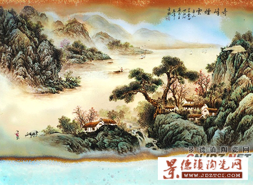 汪野亭以青綠山水影響巨大。以國畫融入陶瓷中,這在山水題材上難度更大,因?yàn)橛粤显?a href="http://iv978.cn" target="_blank">陶瓷繪畫中不像水墨在宣紙上那樣容易揮寫皴染,這就限制了瓷上山水的表現(xiàn)形式。汪野亭先生開拓創(chuàng)新,別開生面地將國畫山水繪畫的神韻融入陶瓷創(chuàng)作中,使瓷山水達(dá)到一個新的高度。在結(jié)合的過程中,不僅對景德鎮(zhèn)傳統(tǒng)的彩繪工藝進(jìn)行了一系列的改革,而且也對傳統(tǒng)“文人畫”作了一些內(nèi)容和形式上的調(diào)整。