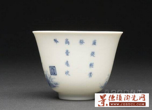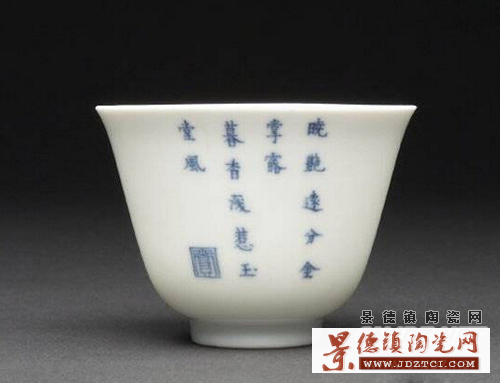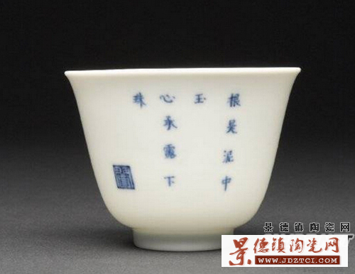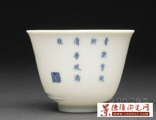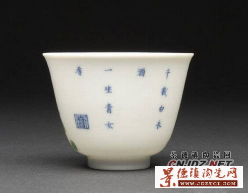 康熙對歷代的瓷器很有研究十分欣賞,康熙十九年下令景德鎮(zhèn)恢復御窯廠,研制新風格的各種瓷器。康熙二十五年景德鎮(zhèn)御窯廠為宮廷燒制一套生活用瓷——“十二花卉紋杯”,第一次把“詩、書、畫、印”在同一器皿上并用,每只杯上繪一種應時花卉,指代歷史上的著名女性,并題上相應的詩句,慣稱“十二月花神杯”。康熙皇帝十分喜愛,幾次南巡都帶在身邊,他不僅喜歡花神杯瓷器的工藝更喜歡花卉配唐詩的文化意境。