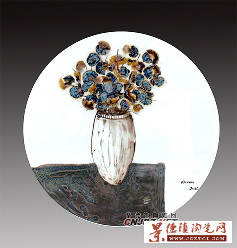 2013年冬天異常寒冷,許多作者都怠惰于創(chuàng)作,尤其是釉下作品,與泥坯、上釉、補(bǔ)水打交道的女藝術(shù)家的辛苦自不必言。王小霞卻在那個(gè)冬天創(chuàng)作出了自己的第一塊《花》系列非賣(mài)品。這件作品整體基調(diào)為藍(lán)色,花束艱難地生長(zhǎng)于石塊之上,藍(lán)色的發(fā)色極好,里面還包裹著冬天的色彩,色釉的粗獷被她演繹成雅致,賴(lài)德全也曾贊嘆“這種顏色配得很雅!”用圓圈代表花,它不是任何一種世間存在的花,它是作者心中的別樣花朵,追求自然無(wú)拘的突破性創(chuàng)作,運(yùn)用不一樣的筆法繪制,柔弱與力量的對(duì)比給人以強(qiáng)烈的視覺(jué)沖擊。