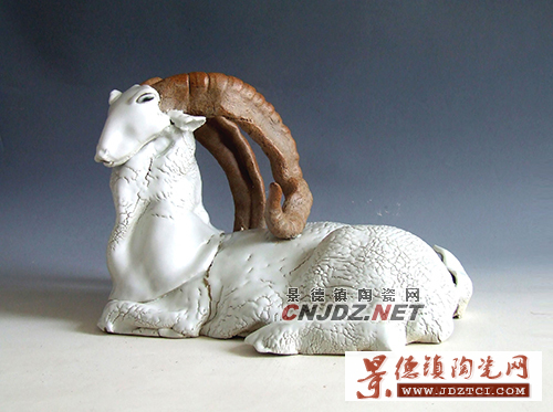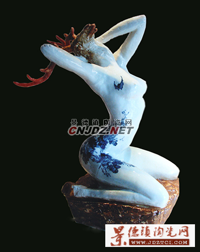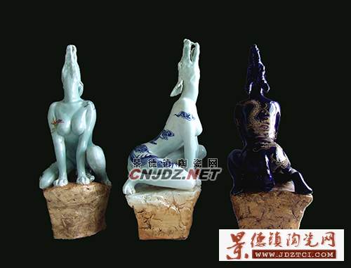 這種人神合一的形象給了趙坤巨大的震撼,她開始嘗試用簡練的雕塑語言表現(xiàn)這個(gè)動(dòng)人的意象,雕塑的主體是少女美麗的裸體,而少女的頭則用各種動(dòng)物的頭直接裝飾:美麗的鹿角、雄性的豹頭、閃著寒光的狼首。在裝飾手法上,趙坤也開始向傳統(tǒng)學(xué)習(xí),大量運(yùn)用了景德鎮(zhèn)原素,青花、粉彩繪出的圖案美侖美奐,表現(xiàn)出一種極具張力的美感。