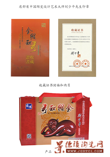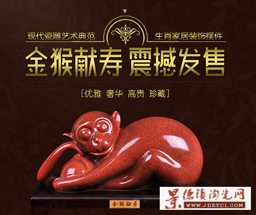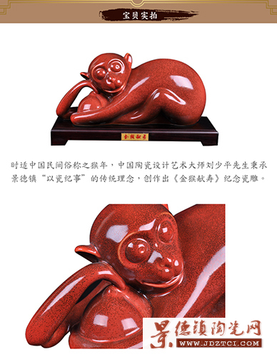 時適中國民間俗稱之猴年,中國陶瓷設(shè)計(jì)藝術(shù)大師劉少平先生秉承景德鎮(zhèn)“以瓷紀(jì)事”的傳統(tǒng)理念,創(chuàng)作出《金猴獻(xiàn)壽》生肖紀(jì)念瓷雕。由景德鎮(zhèn)市昌南窯瓷業(yè)有限公司出品,江西省陶瓷研究所監(jiān)制。