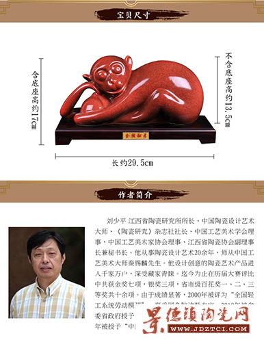 中國陶瓷設(shè)計(jì)藝術(shù)大師劉少平先生用率真的手法,于一只靈猴手里懷抱鮮艷無比、碩大水靈、香氣馥郁的蟠桃,形象動作極富童真,意思更有趣味——“壽且貴”。其鮮活的形象,吉祥的寓意及極具個性的藝術(shù)詞匯,在全國的陶藝界、文玩收藏界及各大媒體界均引起強(qiáng)烈的反響。