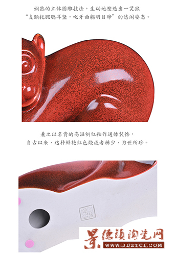 “古面睢盱露瘦月,鷸毛勻賦舒玄云”。猴,自古以來就屬中國造型藝術(shù)題材中的“四靈”、“八瑞”之一。劉大師以嫻熟的立體圓雕技法,生動地塑造出一靈猴“支頤托腮聰耳豎,叱牙曲軀明目睜”的悠閑姿態(tài),無不透露出其天生活潑、孩童般頑劣。稚趣和機(jī)警的野性和特質(zhì),賦予了美猴深邃的文化底蘊(yùn)和現(xiàn)代瓷雕藝術(shù)的審美典范、兼之以名貴的高溫銅紅釉作通體裝飾,更深化了歡愉喜慶的動感和樂韻,以全新的造型語言和色彩語言表達(dá)了“新春納福、金猴獻(xiàn)壽”的良好夙愿。
