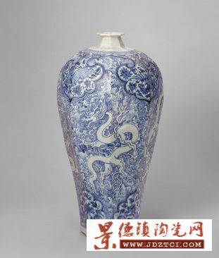 梅瓶瓶身修長,肩飾斜格錦紋,錦紋下一周大如意云頭紋,內(nèi)繪鳳或麒麟穿牡丹圖樣,瓶身中部一周繪4條白龍,襯以青花海水和火焰紋,近足處飾一周如意云頭紋,內(nèi)繪牡丹花葉。造型碩大豐滿,紋飾繁密,層次豐富,構(gòu)圖嚴(yán)謹(jǐn),其龍紋的出現(xiàn)顯著增多是這一時(shí)期瓷器裝飾藝術(shù)的特點(diǎn)。