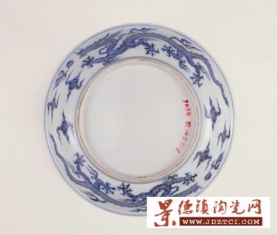 盤內(nèi)壁與內(nèi)底交接處暗劃弦紋一周,有云紋三朵,呈“品”字形排列。內(nèi)壁模印云龍紋。外壁以青花繪二云龍趕珠紋。龍紋筆觸細(xì)膩,生動傳神,承襲了元代及明洪武瓷器的作法。
