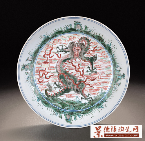 晚明的龍紋,恰如當(dāng)時(shí)社會的政治、經(jīng)濟(jì)衰退一樣,顯得蒼老、無力。崇禎五彩龍紋盤的龍紋臉瘦尖,長胡須,蓬頭散發(fā),爪似蟹爪,顯肚凹腰,恰似一條垂死的老龍。