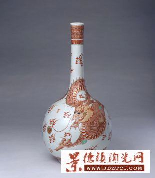 瓶口部刻細(xì)線蒜瓣紋,腹部有粘接痕一周。瓶頸至肩部塑貼一條紅色螭龍,曲體上仰,口銜仙草,由肩部向頸部盤繞,卷尾與首相接,四肢平伏于瓶肩部。白釉上紅螭凸起,效果神奇,頗富藝術(shù)感染力。