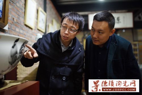 中國(guó)工業(yè)陶瓷藝術(shù)委員會(huì)理事、山東省陶瓷藝術(shù)大師張?jiān)丛聪虿稍L團(tuán)記者介紹最新創(chuàng)作的《吉祥平安》聚寶盆。