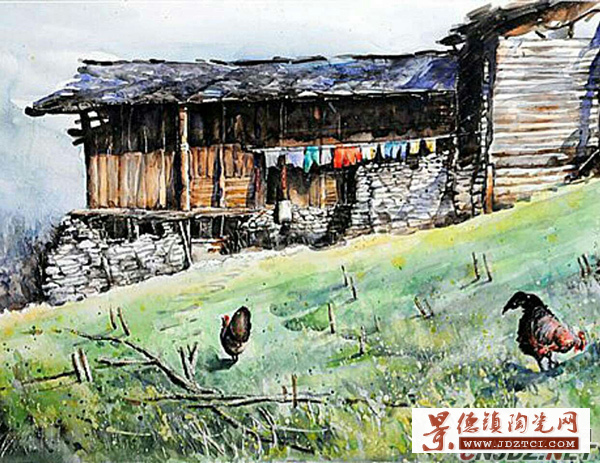 “我感覺(jué)隨著年齡與閱歷的增長(zhǎng),約到后面越有生活的樂(lè)趣!痹谔諟Y明故里長(zhǎng)大的戶(hù)小平,心中也有一個(gè)桃花源的夢(mèng)曉和“悠然見(jiàn)南山”的生活態(tài)度,所以他的作品里總是在不經(jīng)意間將禪與詩(shī)融入畫(huà)中,借物言志,表現(xiàn)他的思想感情和人生寓意,充滿(mǎn)了對(duì)大自然的愛(ài)好,對(duì)生活的熱情。從他的水彩畫(huà)作《失落的記憶》、《大宅門(mén)》和《鄉(xiāng)音》等作品中,就可以看出他在更高層次上師法造化,做到人與自然合二為一,不但回歸消融于自然懷抱,更甚于對(duì)自然的理解和感恩,畫(huà)出山川靈魂,與眾生共舞。