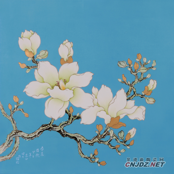 玉蘭為歷代國(guó)畫中常用題材,而于陶瓷繪畫中亦非鮮見,然周國(guó)生此以玉蘭花為表現(xiàn)主題的《夢(mèng)》系列與前人不同。該系列作品顯現(xiàn)出作者的深厚傳統(tǒng)功力,在強(qiáng)調(diào)書法用筆中較一般的工筆玉蘭花更多一份堅(jiān)凝酣暢的氣質(zhì)韻味,而更為重要的是,在這種韻味之下所蘊(yùn)藏的深邃而豐富的象征寓意。