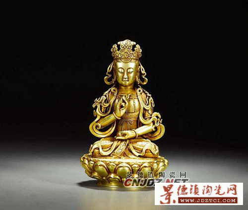明;H:17cm;說(shuō)明:觀世音菩薩是西方極樂(lè)世界阿彌陀佛座前的上首菩薩,又譯為觀自在普渡眾生大慈大悲菩薩,在藏傳佛教中稱雪域高原 是觀世音菩薩的教化之地,稱觀世音為雪域的救主。此尊造像胸垂瓔珞,繡帶輕飄,結(jié)跏趺坐于蓮座之上。整尊造像由純金打 造,造型端莊,各部分比例和諧,線條流暢,觀音雙耳微垂,神態(tài)祥和。明清時(shí)期的純金佛造像,均為宮中擁有,民間不允許制 造,因此這尊純金制造的佛像,乃宮廷造辦處制作,保留至今實(shí)屬難得。