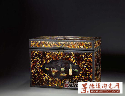 清乾;48.6cm*26.2cm*35.6cm;說(shuō) 明:玳瑁,自古以來(lái)深得歷代貴族或商賈富客之寵愛(ài),被視為傳世之寶,是萬(wàn)壽無(wú)疆之象征。玳瑁用來(lái)制作精美的裝飾品,從漢代的著名詩(shī) 篇《孔雀東南飛》中就有“足下躡絲履,頭上玳瑁光”的詩(shī)句了。到了唐代,玳瑁工藝的制作即已有了較高的水平,女皇武則天即采用玳瑁制作 梳子、扇子、琴板、發(fā)夾,乃至整個(gè)玳瑁標(biāo)本。唐代亦用玳瑁作嵌片,顯示其質(zhì)地、光澤、斑紋的自然美,還與硬木、象牙、螺鈿、琥珀等工藝 相結(jié)合,組成復(fù)合工藝品。到了清代,玳瑁工藝又有了新的發(fā)展。清宮養(yǎng)心殿造辦處的玳瑁工匠來(lái)自廣州和蘇州,清宮玳瑁工藝品主要出自廣州 工匠之手。廣州是清代玳瑁工藝的中心,受輸入的歐洲玳瑁工藝品的影響發(fā)展了玳瑁金屬工藝品,或以銅為器胎作框架,或以玳瑁作嵌片制器 表,或在其上再嵌鍍金飾件或加隱起雕刻者。蘇州玳瑁工藝也有它的特點(diǎn),多用木胎,所飾嵌件都是珊瑚、琥珀,紋樣也都是傳統(tǒng)題材。宮廷玳 瑁器上刻有陰線、隱起或鏤空的團(tuán)壽、紅蝠、萬(wàn)字不到頭、折枝牡丹花蝶等圖案,這是前所未見(jiàn)的。還有不用銅、銀、木作胎的純一色的玳瑁 器。這種無(wú)胎骨的純玳瑁器數(shù)量稀少,在工藝上卻顯示出其獨(dú)立性和新變化、新發(fā)展。其是經(jīng)加熱、壓粘等手段完成的,在粘接縫處不露痕跡, 用陽(yáng)線、隱起或鏤空等技術(shù)雕飾紋樣。清代宮廷玳瑁器是由廣州和蘇州兩地玳瑁名工在皇帝旨意下制成的,具有富麗、豪華、典雅、吉祥的皇家 風(fēng)格,不同于有著鮮明地方風(fēng)格的廣州和蘇州玳瑁器。由上我們了解了玳瑁工藝的歷史后,再來(lái)研究此件作品。其選料精美而巨匹,世間少見(jiàn), 用燈照之,如萬(wàn)花筒般俏麗。其上百寶鑲嵌博古圖,精美異常,這類題材常見(jiàn)于宮廷紫檀家具之上,而此類家具、銅胎畫(huà)琺瑯器、象牙等宮廷物 件很多都是出自于廣東工匠之手,其中有地方進(jìn)貢之物,亦有于宮中造辦處所作。綜述上述分析比較來(lái)看,此件玳瑁箱子,可謂珍罕之絕品,乃 是集自然材料與人工雕琢為一身的精美藝術(shù)品,難得至極。