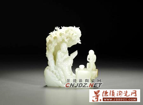 清乾;H:12.6cm;說(shuō) 明:“古香”、“太璞”篆書(shū)雙款參考:1.《欽定秘殿珠林 續(xù)編》,(清)王杰等輯,上海古籍出版社,1995年,132頁(yè)。 2.《清高宗御制詩(shī)文全集》之《御制清高宗御制詩(shī)初集》,二九 卷。3.《故宮書(shū)畫(huà)錄(卷八)》,國(guó)立故宮博物院,1956年,第四 冊(cè),73頁(yè);第五冊(cè),333-334頁(yè)。說(shuō)明:白玉山子,隨形而雕,玉 質(zhì)上乘,溫潤(rùn)滋澤,山峰聳立,壁崖料峭,山峰巖壁處的局部分布 有黃褐色玉皮,燦如黃粟,艷如朝陽(yáng)。治玉者隨料之勢(shì)雕琢仙山美 景,其運(yùn)刀如筆,依據(jù)皴法,表達(dá)山勢(shì)險(xiǎn)峻,層巒疊嶂,完全將奇 山仙洞之深淺層次表達(dá)無(wú)遺,極具圓雕立體感。山間菩提樹(shù)下,仙洞之中,第十六羅漢--阿必達(dá)尊者靠壁而依,一手持卷,一手垂 于膝上,靜坐入定。細(xì)細(xì)觀之,羅漢精神矍鑠,雙眉微挑,雙耳垂 肩,面容安詳,禪意深遠(yuǎn),其身形精瘦,上身赤裸,筋骨嶙峋,臂 上衣帶圍裹,隨意而安之情盡顯。山子背面打磨光潔,上有帝王題 寫(xiě)之偈語(yǔ):「御制羅漢贊,第十六阿必達(dá)尊者,梵帙閱畢,焚香熏 之,是何佛法,不可議思。生住異滅,萬(wàn)法歸一,胡不視此傳神之 筆!怪骡j刻一陰一陽(yáng)兩款方印「古香」、「太璞」。此器受清 代院體畫(huà)的影像,完全是將畫(huà)之形象,以立體三維的方式表達(dá)在上 等白玉之上,畫(huà)面琢磨細(xì)膩,注重層次,可謂清代宮廷玉雕山子之 精品,更是近年來(lái)海外回流之上上等佳品。古代采玉全靠人工,和 田好玉之獲得,靠緣分運(yùn)勢(shì)為主,難度之大,猶如登天。此件作品 所用玉料應(yīng)為新疆葉爾羌所產(chǎn),材料碩大,珍貴異常,因而在作品 的藝術(shù)構(gòu)思上,充分利用原料形狀的特點(diǎn)雕刻,其造型隨玉料之 形,自然意趣,圓雕羅漢手捧佛經(jīng),神態(tài)虔誠(chéng),極為生動(dòng),反映了 清代乾隆時(shí)期制玉水平之妙到顛豪,不惜工本,極為震撼。故宮博物院藏有多尊類似玉雕羅漢山子可供參考。