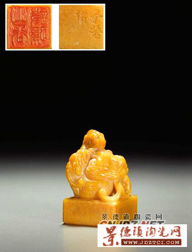 清;3cm*3cm*5cm;說(shuō) 明:印文:山谷詩(shī)村。匣中夜半雙龍吼,乃知神物不自藏。器身形取四方,上 雕雙龍,回頭翹首,口微張,獠牙微露,雙目圓睜,直視前方,整體雕工細(xì)膩,生動(dòng),大有清代皇家之氣魄。此印石石質(zhì)金黃,蘿卜絲紋明顯,質(zhì)地細(xì)膩,剔透無(wú)比,幾近田黃凍石之列,可謂“六德”兼?zhèn)。是難得的田黃印石精品。田黃是葉臘石的一種,產(chǎn)于福建壽山溪流域的水田之下,是制作印章的珍品石材,與其他產(chǎn)至壽山的石材,統(tǒng)稱為“壽山石”。 因其色普遍呈黃色,又取于水田之中,故稱之為田黃。又因其產(chǎn)量稀少,色澤高貴,自古便有“石中帝王”之稱。從顏色上分, 田黃主要分黃、白、紅、黑四色;黃的稱“田黃”,白的稱“白田”,紅的稱“紅田”,黑的稱“黑田”,黃白兼有者稱“金裹銀”。其中以田黃為貴,而黃色又分有黃金黃、枇杷黃、桂花黃及熟栗黃等。田黃石質(zhì)較軟,溫潤(rùn)膩凝。田黃石一般都含有石花,這種石花近似糠蘿卜狀,以遍體有糠蘿卜紋尤其珍貴,除此之外,一般 亦有石根石格以及帶有石皮。常言田黃有六德,亦有稱田黃有九德,無(wú)論幾德,均秉承“細(xì),結(jié),潤(rùn),膩,溫,凝”等之評(píng)石原則,如能兼?zhèn),更可譽(yù)為上品。