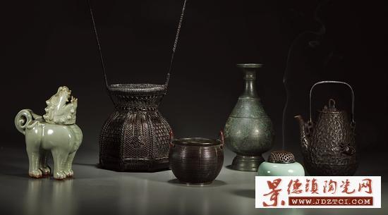 悠然自得•茶器花器香器專場為新增拍場,拍品50余件。包含瓷器、紫砂、竹器、木器、銅器等材質(zhì)。茶器中清•紫砂小茶壺一對小巧精致,估價在0.3萬-0.5萬元;ㄆ髦兄窬幓ㄆ鳛槭状瓮瞥觯鶠槎兰o(jì)制作,兼具實用與觀賞價值,估價均在人民幣0.5萬元以內(nèi);清•粉彩荷葉紋花盆成套出現(xiàn),估價在2.5萬-3萬元。香器中香爐、香薰眾多,以元、明時期浙江龍泉窯為主。