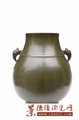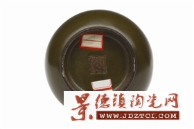 茶葉末瓷器的生產始于唐代,如在陜西耀州窯遺址中出土了茶葉末釉瓷器,釉色有黃綠、褐綠等。唐以后,有些窯廠也有茶葉末釉瓷器,但這類茶葉末釉瓷器,可能是在燒制青釉或黑釉瓷時,由于胎釉原料及燒成時產生的變化,而出現(xiàn)茶葉末釉色。清代雍正、乾隆時期,景德鎮(zhèn)御窯廠在繼承古代優(yōu)良傳統(tǒng)的基礎上將其應用于白瓷胎上,精工細作,燒制出富于變化的多種色澤的茶葉末釉瓷器。據唐英的《陶成紀事》記載:“仿廠官窯,有鱔魚黃、蛇皮綠、黃斑點三種!秉S斑點即為“茶葉末”。從傳世品看,雍正時是有茶無末,乾隆時是茶末兼有。如鎮(zhèn)江博物館藏乾隆款茶葉末釉綬帶葫蘆瓶,高26.2厘米,口徑2.8厘米,底徑8.2厘米;呈葫蘆形,小口、細直頸,兩側為對稱的彎曲綬帶形系耳,俊秀飄逸,中間為束腰式箍形裝飾。瓶底足外撇,圈足露胎,胎體較薄,底部刻有“大清乾隆年制”六字三行方圖章篆款。全器施茶葉末釉,釉色純正,色調沉穩(wěn),綠中閃黃,黃中閃綠,圈足釉色較深,足部釉與露胎相接處有刮削時無意留下的一圈小鋸齒痕,造型優(yōu)美,線條流暢,制作精細。茶葉末釉獸耳尊,高45厘米,口徑21厘米,底徑22.3厘米;口微斂,兩側為對稱的獸形系耳,下腹垂大,圈足;圈足內有“大清乾隆年制”六字三行方圖章篆款。全器施茶葉末釉,色澤深沉,典雅古樸。此器為仿古銅器,具有青銅器的沉著穩(wěn)定的色調。
