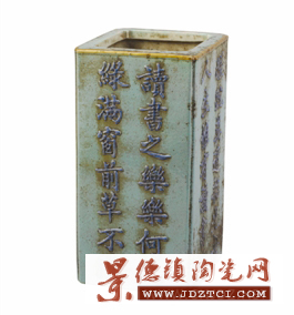 爐鈞釉的釉色傳承了鈞釉的特點(diǎn),也是千變?nèi)f化,色彩斑斕的。形成原因與其低溫爐燒,釉料自然流淌有很大關(guān)系。正如《南窯筆記》中所說的那樣:“爐鈞一種,乃爐中所燒,顏色流淌中有紅點(diǎn)者為佳,青點(diǎn)次之!贝_實(shí)如此,在清代雍正時(shí)期和乾隆早期所生產(chǎn)的爐鈞釉瓷,釉色中有鮮艷的斑點(diǎn),紅中泛紫,俗稱“高粱紅”。而清代中晚期這種斑點(diǎn)及釉料流淌感均有所下降,這件清代爐鈞釉詩文方瓶已達(dá)不到“高粱紅”的效果,經(jīng)專家鑒定為清代同治時(shí)期的產(chǎn)品。