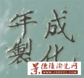 這件清代爐鈞釉詩文方瓶(圖1),高26厘米,口徑13.5厘米,底徑13.5厘米,方口,寬沿,口沿邊緣描金,瓶身施爐鈞釉,釉色青綠,且滿布月白、淡紅色斑點(diǎn),瓶體四面各書兩句七言詩,方圈足,瓶底內(nèi)書“成化年制”四字寄托款(圖2)。