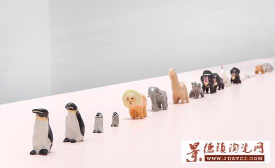 她還有一組可愛的動物俑,形態(tài)極小而憨態(tài)可掬。這些動物的形象源于女兒的童話書,有獵豹、老虎、恐龍、企鵝、獨(dú)角獸、狒狒等,它們與人類的生活距離遙遠(yuǎn),也很少看到用瓷器來制作的案例,“我女兒喜歡把它們排成一條線!盨hioKusaka說道,這讓她在布展時(shí)排成一條直線而非場景,她覺得這就像一場表演。