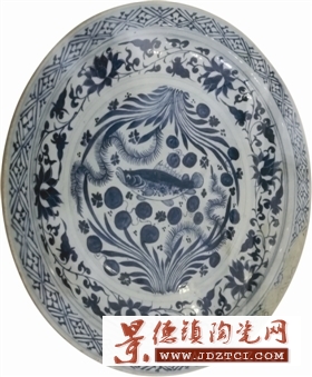 在二樓的古陶瓷館,筆者欣喜地發(fā)現(xiàn)館內(nèi)中國古陶瓷器陳列了滿滿當當,從高古瓷、陶器至明清出口瓷、克拉克瓷等應(yīng)有盡有,尤其令人震驚的是二樓陳列室中央,赫然安放了三件元青花大盤,每件大盤的直徑均達四十多厘米。三件大盤名稱分別為藍地白花云肩鳳紋花口盤、花果飛鳳紋菱口折沿盤、鱖魚水藻紋大盤。三件元青花大盤,氣勢恢宏,光彩奪目。